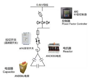 ANSVC無功補償裝置適用于頻率50Hz電壓0.4KV的系統中,ANSVC低壓無功功率補償裝置并聯在整個供電系統中,能根據電網中負載功率因數的變化控制電力電容器投切進行補償。其原理為:ANSVC低壓無功功率補償裝置通過CT采集電流、電壓信號,由無功補償控制器計算,計算出投切電容器的方案,通過投切開關控制各組電力電容器投切。