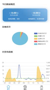 可按日、月、季度、年查看充電次數、充電時長、充電金額,同時顯示對應的曲線圖。