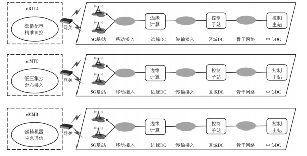 根據(jù)電網(wǎng)的業(yè)務(wù)需求,可分為:低時(shí)延的智能配電、負(fù)控業(yè)務(wù),多連接的低壓抄表、分布接入業(yè)務(wù)和大帶寬的巡檢機(jī)器、應(yīng)急通信業(yè)務(wù);結(jié)合5G邊緣計(jì)算的特點(diǎn),各種類型的業(yè)務(wù)通過網(wǎng)關(guān)匯聚,接入到邊緣計(jì)算中心;根據(jù)業(yè)務(wù)的需要,進(jìn)一步上傳到控制子站或主站。