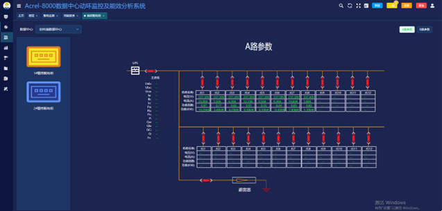 1)配電監(jiān)測可以通過一次圖形式幫助用戶了解每一個機(jī)柜的運(yùn)行情況,數(shù)據(jù)實(shí)時刷新。