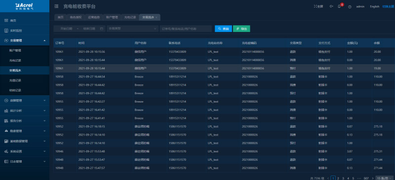 顯示所有訂單數(shù)據(jù),可以對訂單按照充電站、充電樁、支付方式、交易狀態(tài)等進(jìn)行分類查詢,可對充電中的充電樁進(jìn)行停止充電操作。