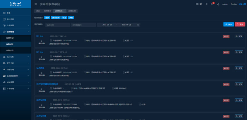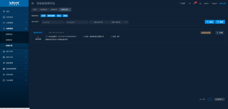 顯示充電樁的故障信息及處理進(jìn)度,故障類型包括過壓、欠壓、空載、絕緣檢測故障、漏電、過溫、短路等。