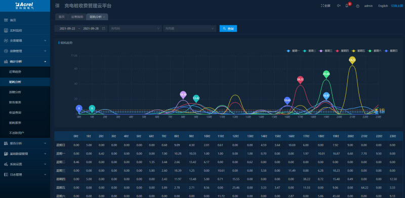 可查看指定時(shí)段充電站和充電樁的用電量,顯示對應(yīng)的能耗趨勢圖并進(jìn)行同環(huán)比分析。