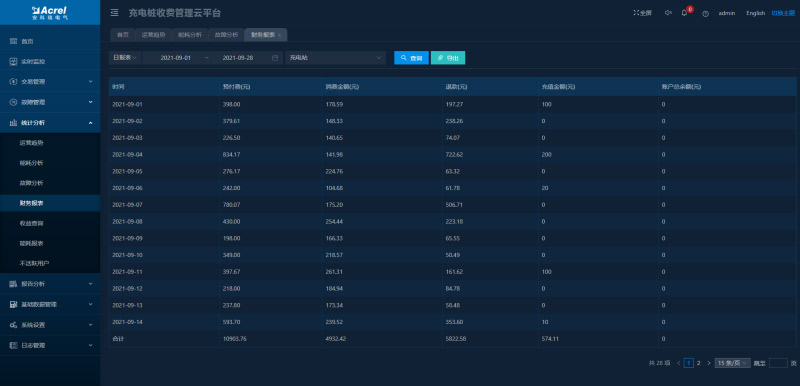 可按日、月、年查看各個(gè)充電樁的用電量,可導(dǎo)出成excel表格。