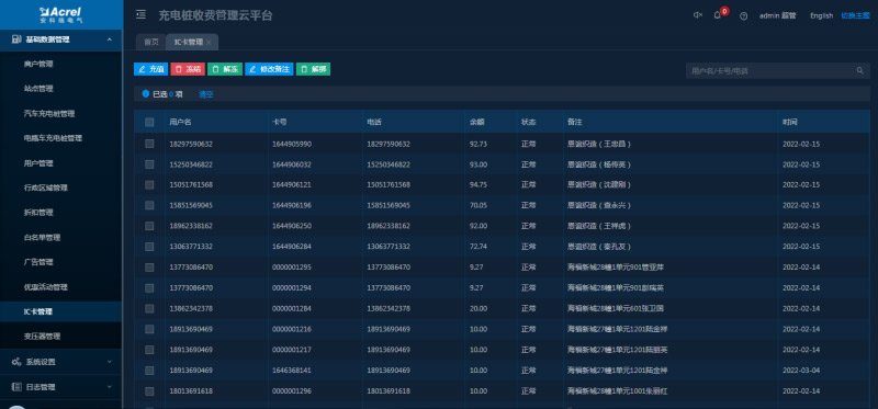 顯示所有關(guān)聯(lián)充電用戶的賬戶信息,可進(jìn)行充值、退款、凍結(jié)、解凍、注銷等操作。