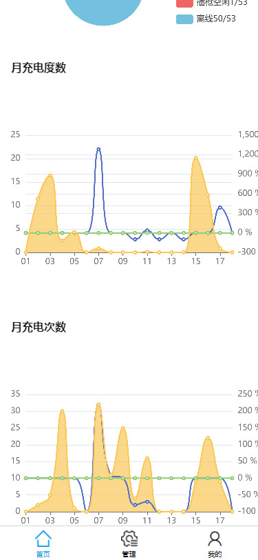 可按日、月、季度、年查看充電次數(shù)、充電時(shí)長、充電金額,同時(shí)顯示對應(yīng)的曲線圖。