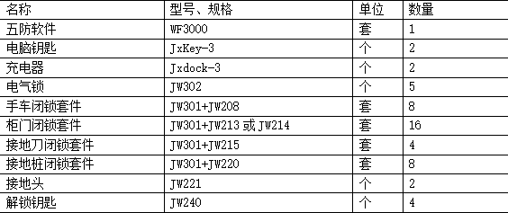 針對10kV開關柜,每臺斷路器配置五防電氣鎖1把,每個手車(包含斷路器手車、PT手車、隔離手車)配置手車閉鎖套件1套,按手車數(shù)量的2倍配置柜內閉鎖套件,每個接地刀與隔離刀配置接地刀閉鎖套件1套,配置接地頭(按柜子數(shù)量的一半配置)。五防解鎖鑰匙4把、充電器2個、電腦鑰匙2把、微機五防軟件一套。