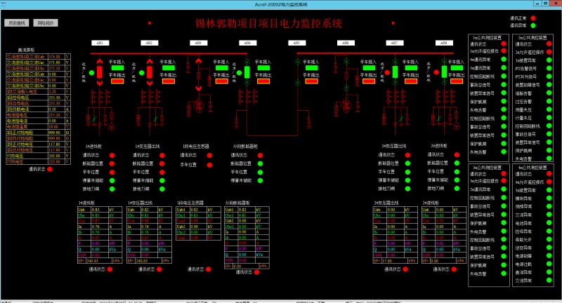 Acrel-2000電力監(jiān)控系統(tǒng)可以直觀顯示一次系統(tǒng)圖,并實時顯示10kV電壓等級各回路的遙測量、遙信量和報警信號等。遙測量包括電壓、電流、功率、功率、電能等電參量等;遙信量包括中壓開關柜內路斷路器、手車、隔離開關、負荷開關、地刀開關的分合狀態(tài)、斷路器彈簧儲能狀態(tài)及遠方就地控制狀態(tài);報警信號包括微機保護裝置的告警信號、保護跳閘信號及裝置異常信號。
