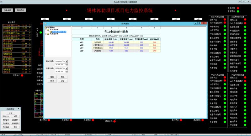 Acrel-2000電力監(jiān)控系統(tǒng)可以查詢各回路或設備指定時間的運行參數(shù),報表中顯示電參量信息應包括:各相電流、三相電壓、總功率因數(shù)、總有功功率、總無功功率、正向有功電能、溫度值等。可以按照日、月、年的格式進行查詢、導出、打印。