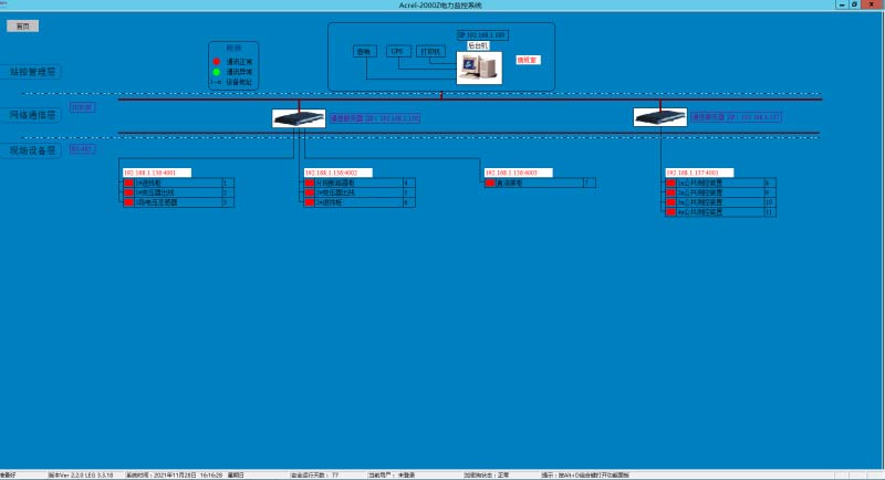 Acrel-2000電力監(jiān)控系統(tǒng)支持實時監(jiān)視接入系統(tǒng)的各設備的通信狀態(tài),能夠完整的顯示整個系統(tǒng)網絡結構;可在線診斷設備通信狀態(tài),發(fā)生網絡異常時能自動在界面上顯示故障設備或元件及其故障部位。