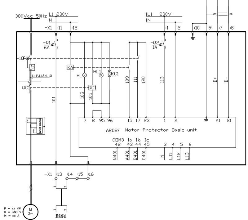 圖2  ARD2F智能型電動機保護器應用于某水泥廠電動機設備控制回路接線圖